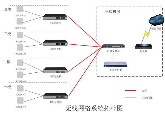 無線網(wǎng)絡(luò)采用無線接入點(AP) +無線控制器(AC) 的企業(yè)級無線網(wǎng)絡(luò)系統(tǒng)架構(gòu),星型拓?fù)浣Y(jié)構(gòu)。在